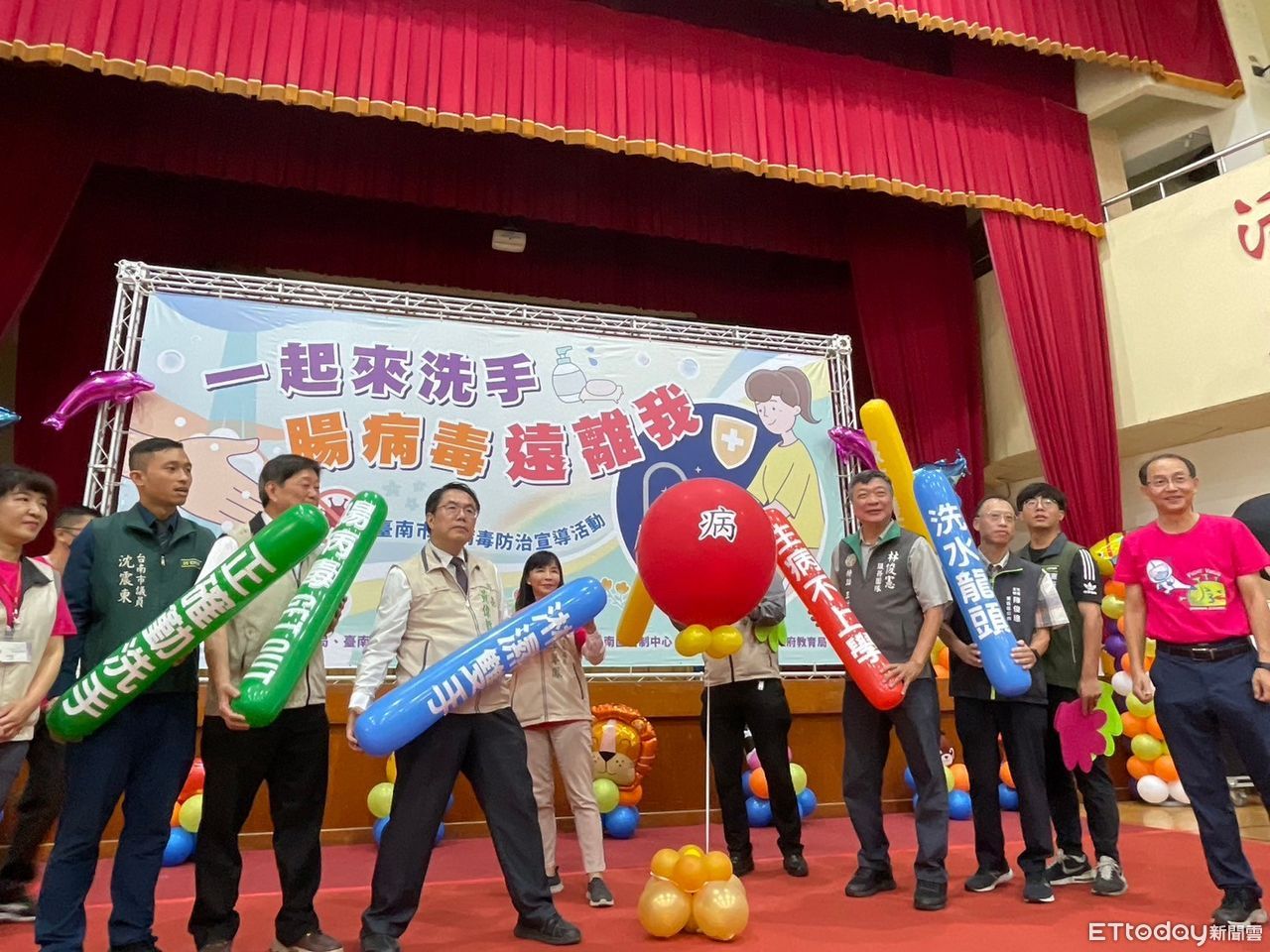 ▲台南市長黃偉哲率員共同宣誓對抗腸病毒,並重點示範正確洗手步驟,呼籲學生們養成良好的衛生習慣,共同對抗腸病毒,「手」護健康。(圖/記者林東良翻攝,下同)