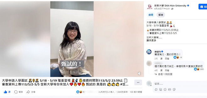 ▲ 世新大學「申請入學二階甄試」短影發布不到一週創下百萬觀看。(圖/世新大學提供,下同)