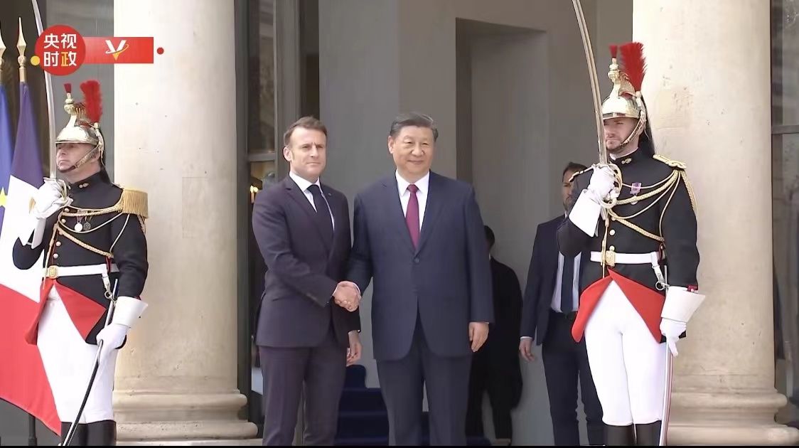 《央視》釋出最新畫面,習近平乘車抵達愛麗捨宮,法國總統馬克宏已在門口熱情迎接,兩人見面時氣氛熱絡,握手合影時趁機交談寒暄。
