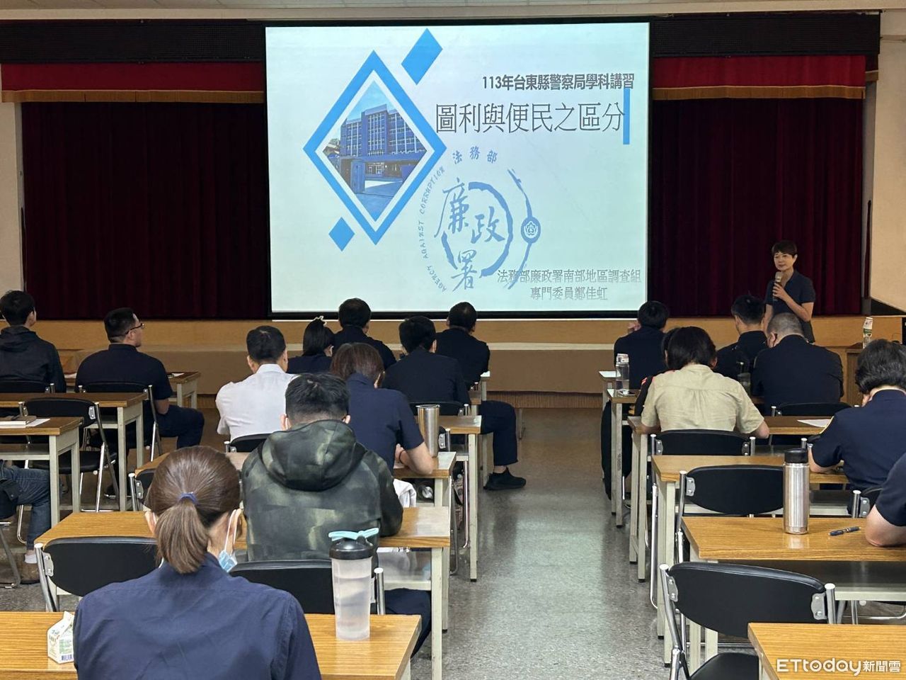為避免警察同仁,犯下與其他警察機關同樣的錯誤,台東縣警察局積極辦理各項防貪宣導活動,以「警察人員保密義務與違失案例」、「圖利與便民之區分」為主題,在警局大禮堂,舉辦廉政法紀宣講,邀請有豐富偵辦公務員違法貪瀆經驗的,法務部廉政署南部地區調查組專門委員鄭佳虹,擔任課程講座,課程中講授她辦案經驗及案例解析,跟與會人員分享,提醒避免觸法,並能合法兼顧便民措施,全程氣氛熱絡,讓聽講之警察同仁獲益良多。