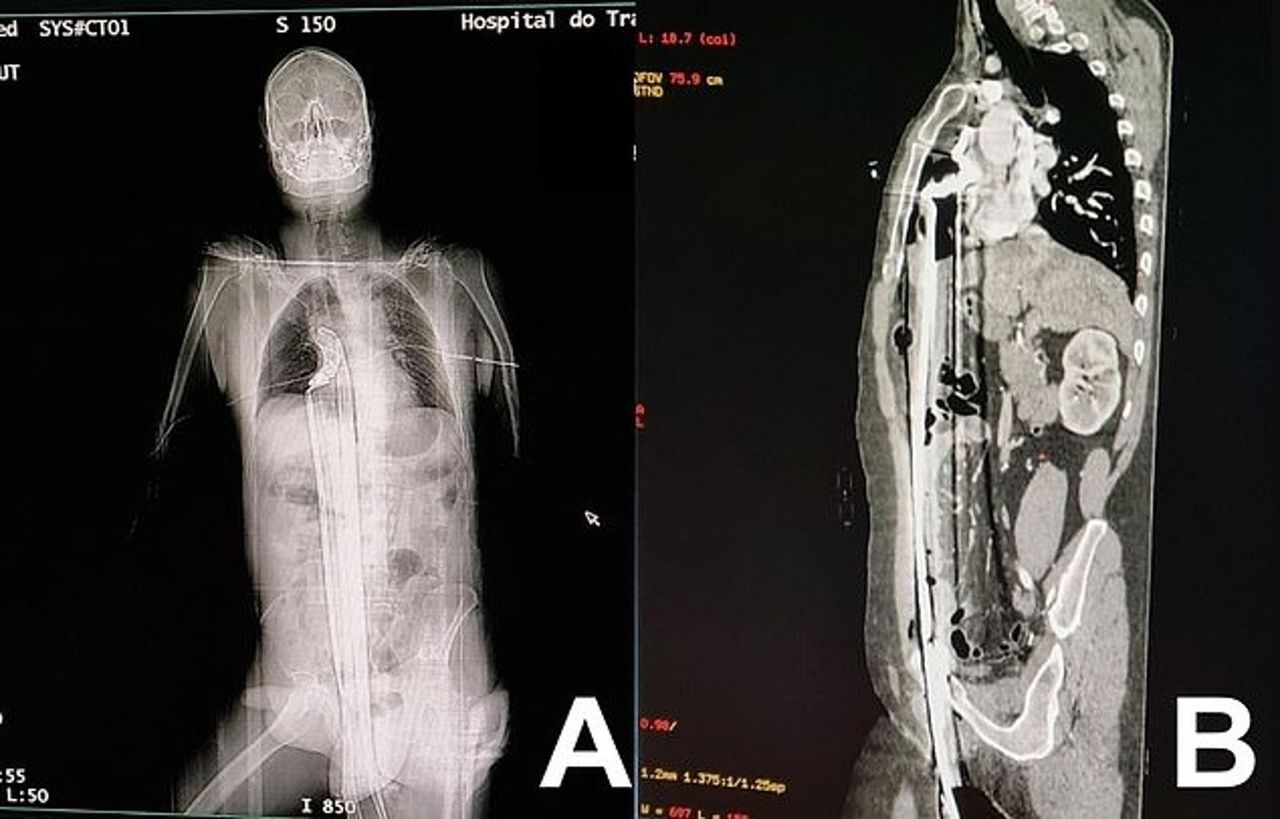 巴西一個醫學團隊在最新一期《國際外科手術病例報告期刊》(International Journal of Surgery Case Reports)刊登一個奇特的病例,一名57歲男子被一條長約91公分的鋼條,從下體插入並貫穿全身,頂到肺部靠近橫膈膜的部位,但男子竟然奇蹟似地生還,而且術後復原狀況良好。