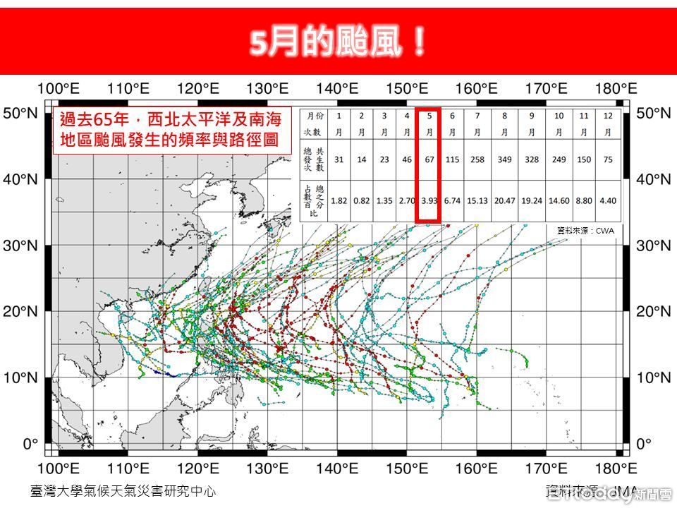 台灣大學大氣科學博士、氣象專家林得恩在臉書發文指出,過去65年的氣候資料顯示,5月份西北太平洋及南海地區共有67個颱風生成,發生頻率佔全年統計總數的3.9%,生成個數雖不算多,但與前1個月相比快速增加1.2%,顯見生成數量尚有持續增加的趨勢。
