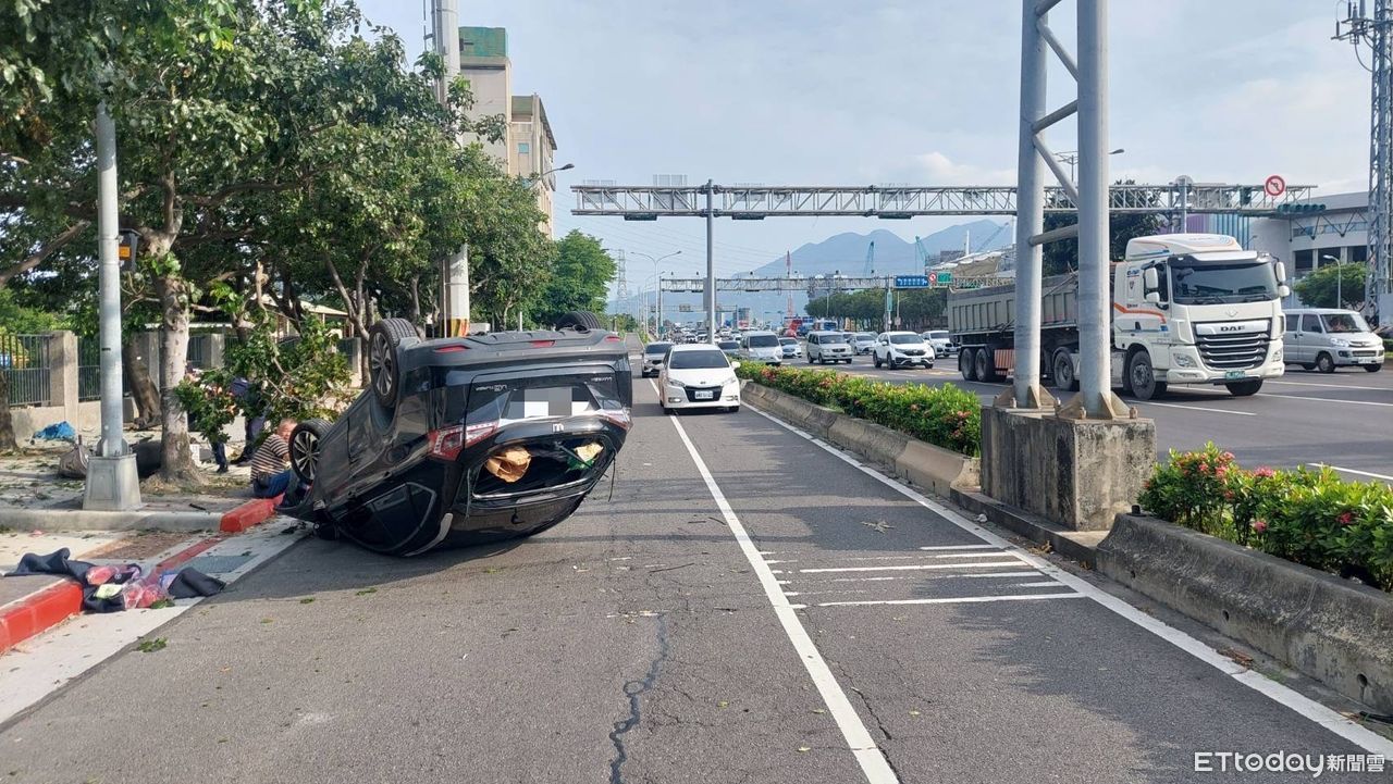 ▲北市士林監理站7日上午發生一起自撞車禍整輛車四輪朝天。(圖/記者黃宥寧翻攝)