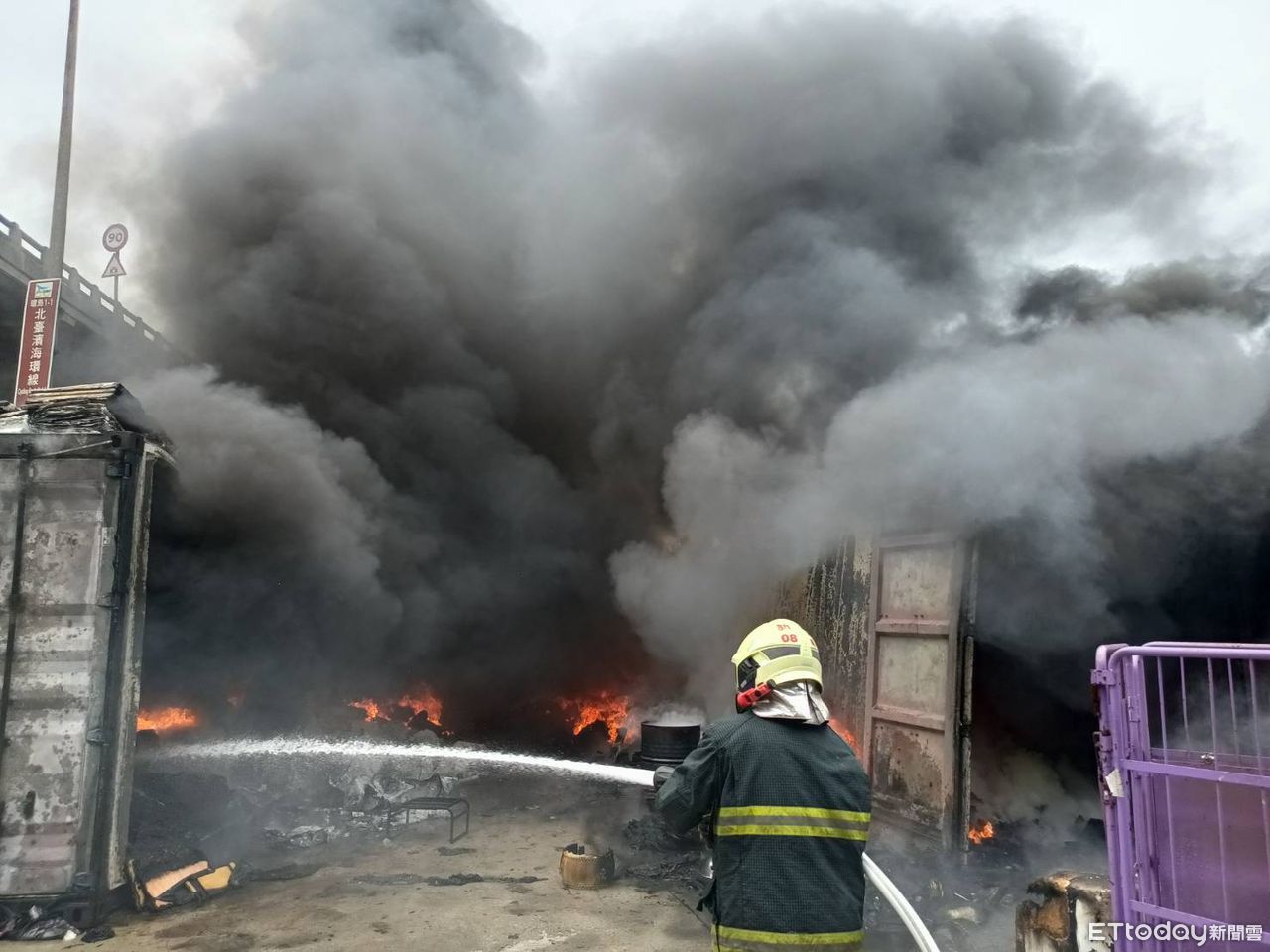 ▲新竹縣新豐鄉貨櫃火警,濃煙直竄天際。(圖/記者陳凱力翻攝,下同)