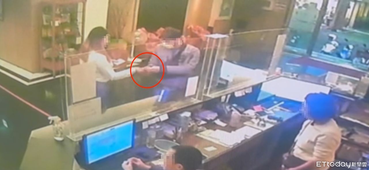 ▲監視器拍下張男把信用卡及現金1300元交給櫃台人員 。(圖/記者陳以昇翻攝)