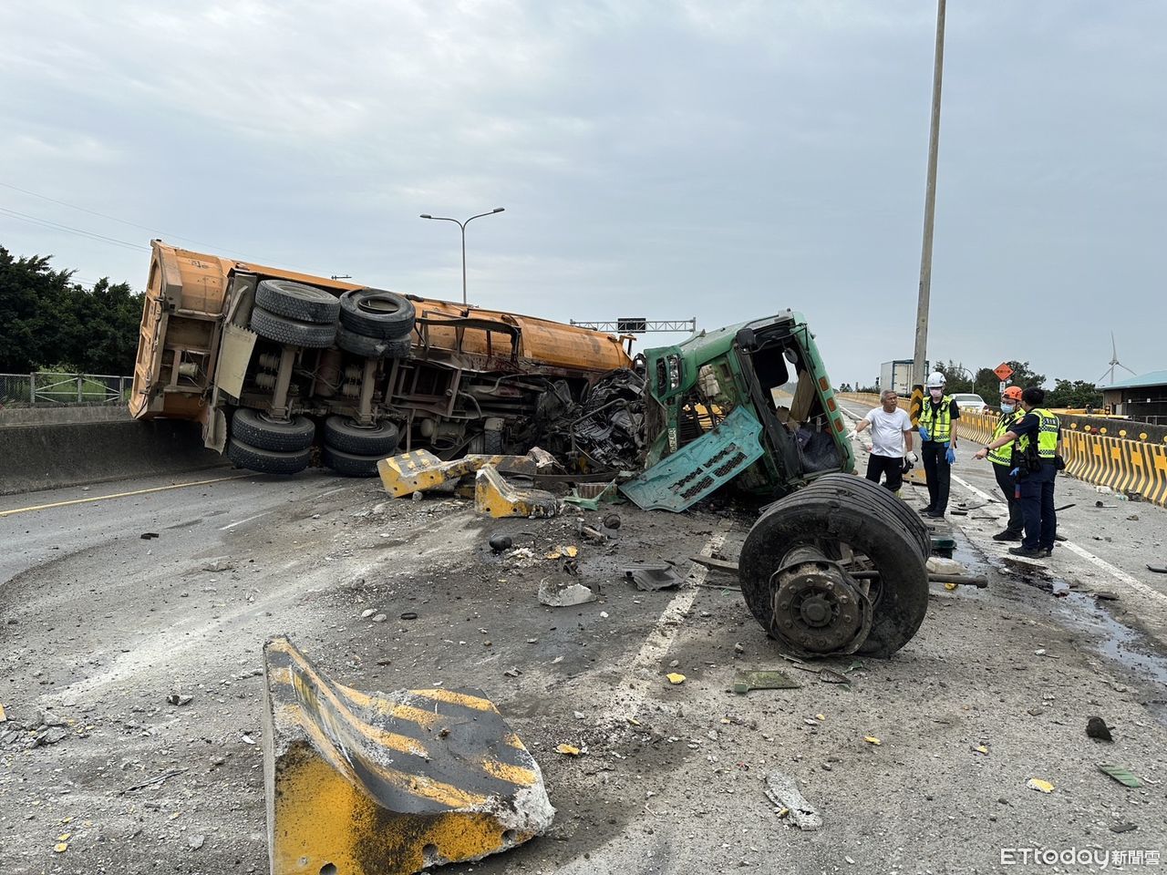 ▲台61線南下94K,聯結車自撞護欄車頭。(圖/民眾提供)
