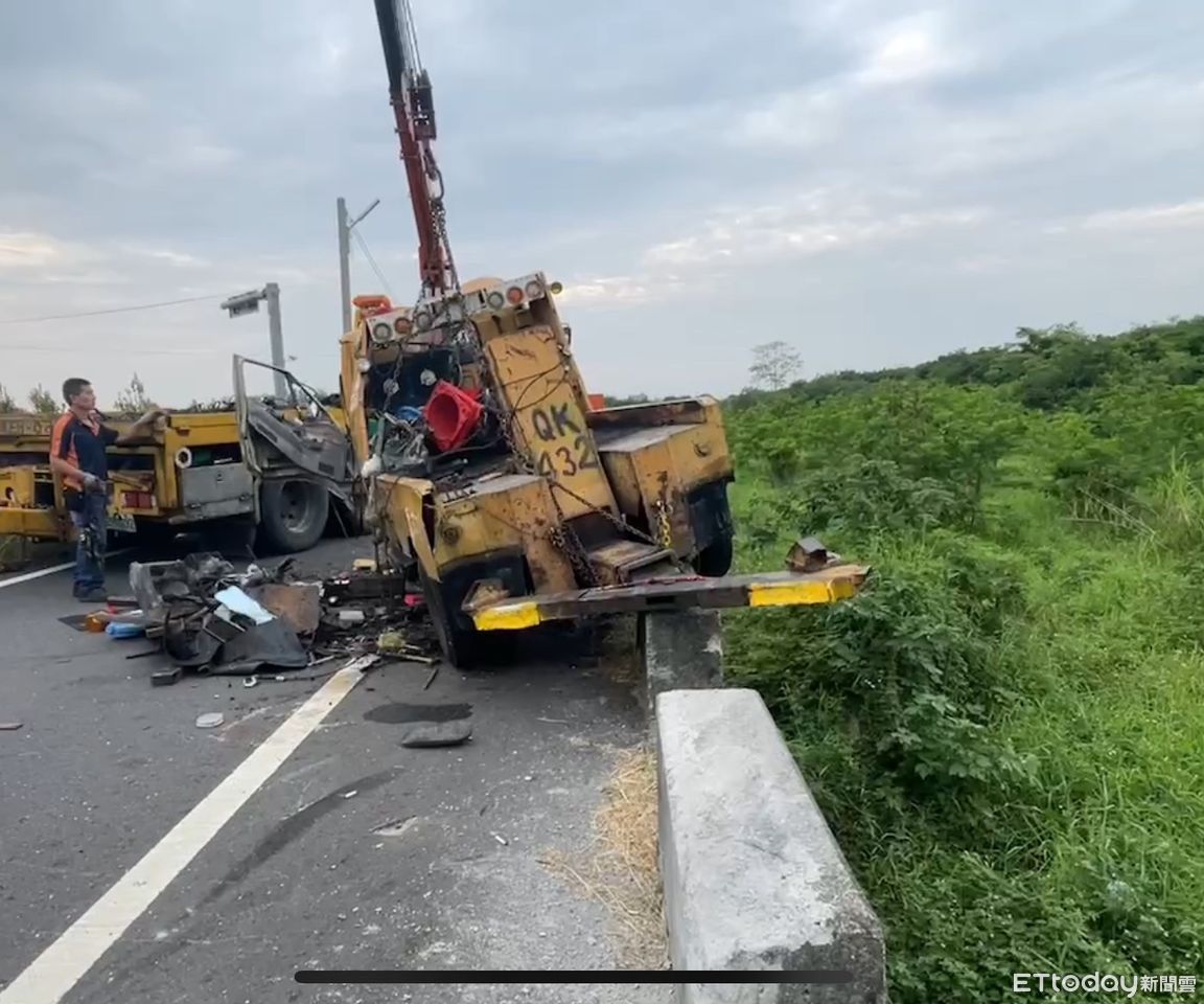 嘉義縣太保魚寮遺址7日下午一高速公路拖吊車疑自撞鄉道護欄後翻覆,巨大聲響引來附近居民趕往關心,只見車頭變形扭曲,前擋風玻璃破碎,車內物品散落一地,50歲駕駛被救出時沒有呼吸心跳。