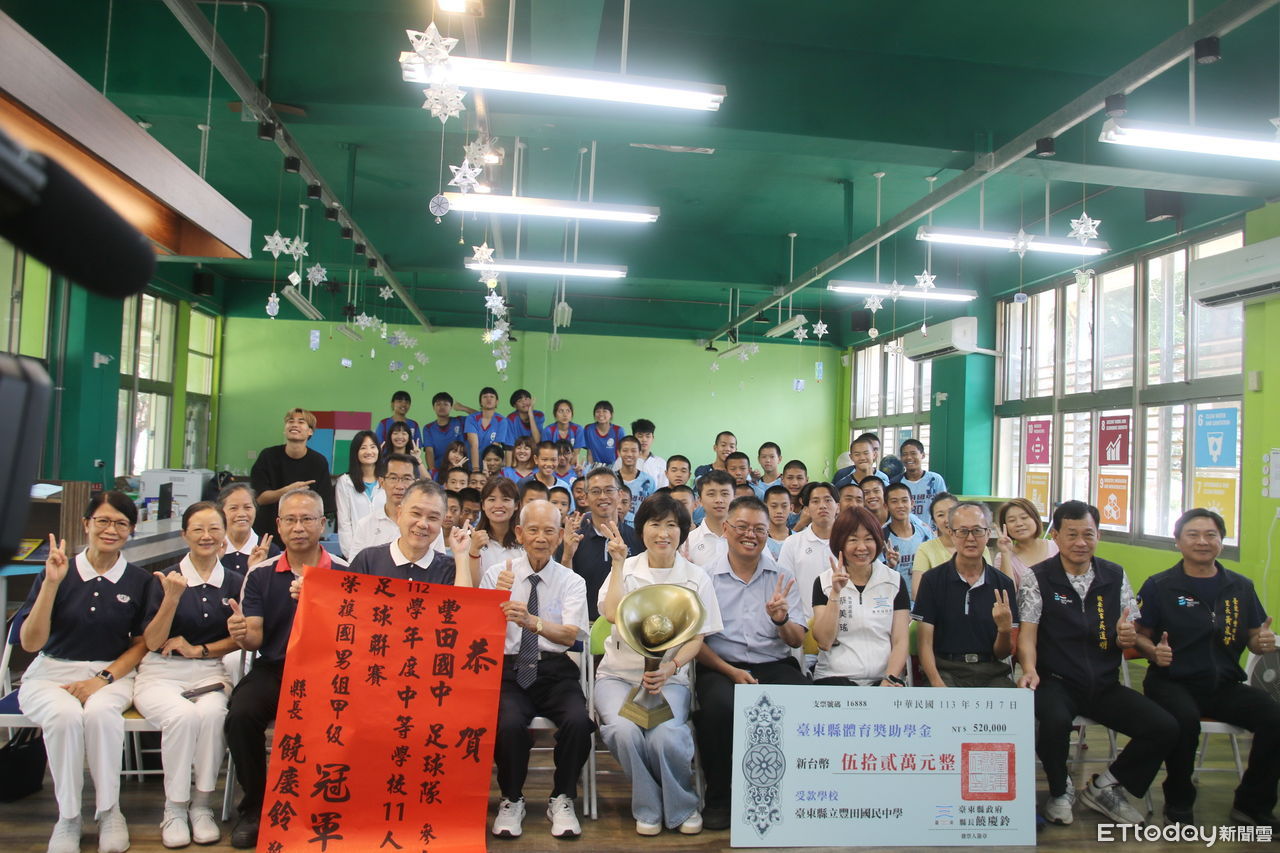 睽違4年,台東縣豐田國中足球隊榮獲中等學校足球聯賽11人制國男甲級冠軍,台東縣長饒慶鈴7日特別前往豐田國中參加慶祝獻獎活動,頒贈紅榜、頒發52萬元體育獎助學金嘉勉,並招待小將們吃牛排慶功。