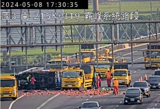 國道三號北向215.5公里處發生翻車事故!一輛小貨車不明原因翻覆橫躺路中,車上物品散落一地,事故占用外2車道,造成車流回堵至少2公里。警消獲報緊急趕往現場排除,至於詳細事故原因仍待調查釐清。