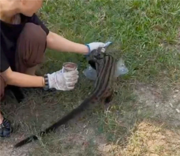 據《快科技》報導,從網友發布的影片裡可以看到,一隻有著黑色條紋皮毛和長尾巴的動物在草地上不時發抖,旁邊一名女子正在餵食,引發路人圍觀。