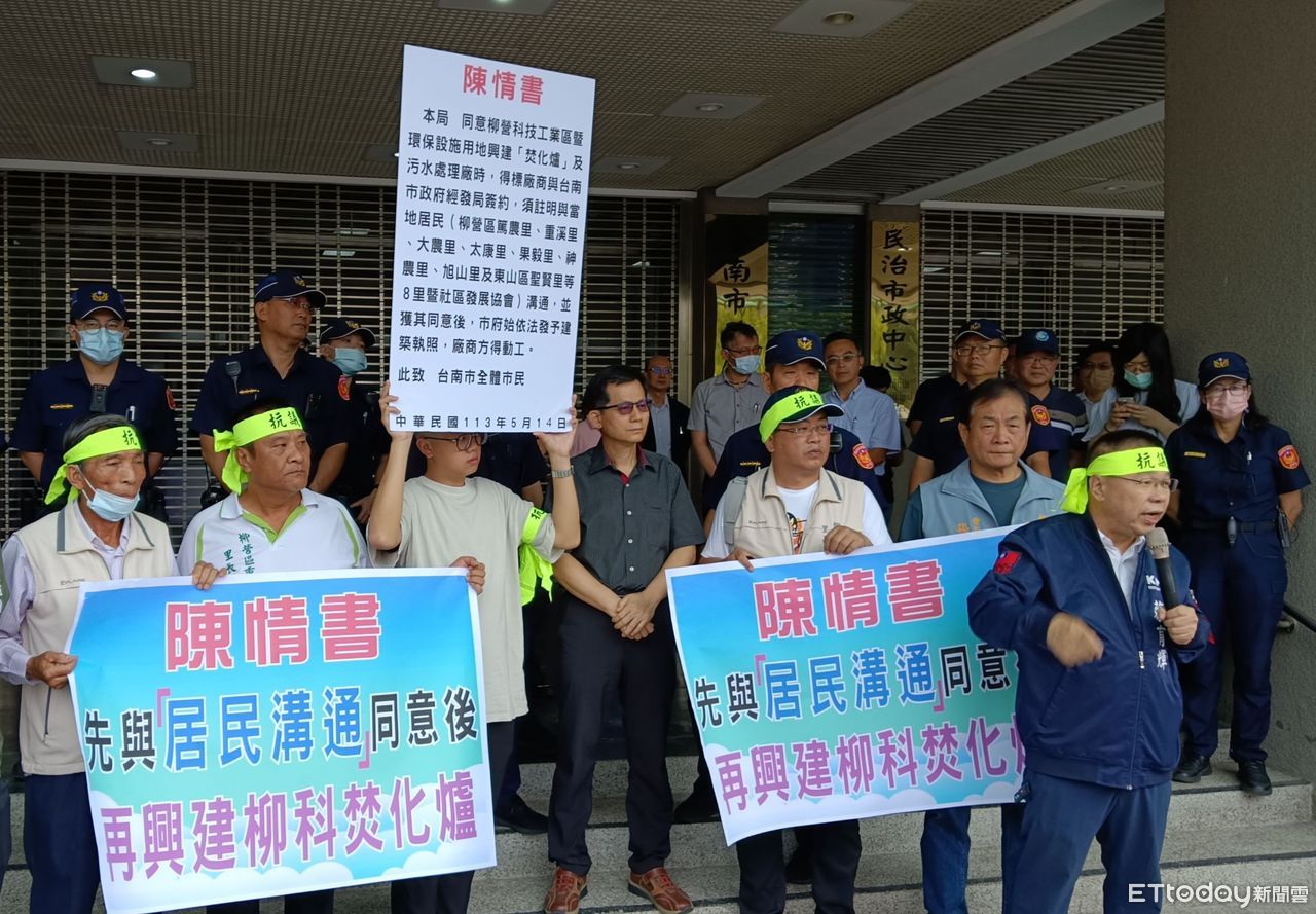 ▲台南市議員蔡育輝14日陪同柳營科技工業區附近里長、居民約500人,頭綁布條,前往台南市政府民治中心拉白布條、舉標語抗議。(圖/記者林東良翻攝)