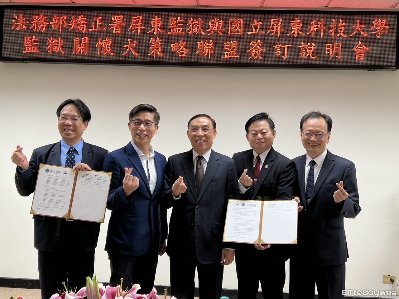 法務部矯正署屏東監獄今(14)日與國立屏東科技大學簽訂策略聯盟備忘錄,在法務部部長蔡清祥、立法委員鍾佳濱的見證下,結合雙方的優勢條件,由屏東科技大學工作犬訓練中心提供專業師資,供屏東監獄推動專屬於矯正機關的「監獄社交關懷犬」訓練課程。