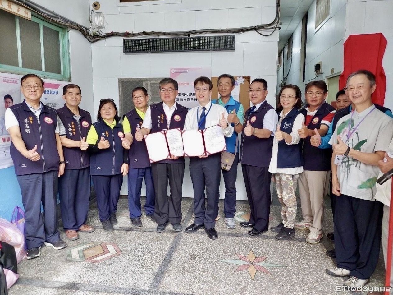 ▲嘉邑行善團由徐文志理事長(圖中)攜手嘉義醫院莊仁賓院長(圖右2)前進芳春公寓推動健康識能 。(圖/記者翁伊森翻攝)