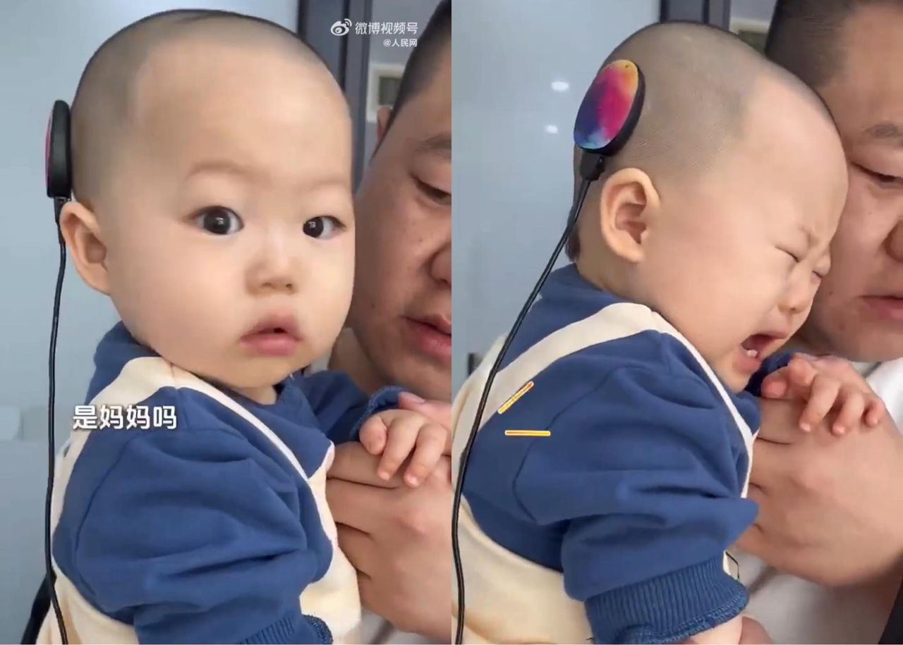 據《人民網》報導,近日,遼寧瀋陽,聽障寶寶佩戴人工耳蝸,不安的父母試探性地叫了兩聲「兒子」,寶寶第一次聽到聲音後,瞬間哭出聲。讓不少網友感動落淚。