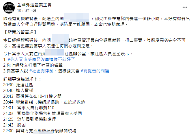 一名外送員21日送餐至內湖某社區時,受困於在電梯內長達1小時,期間按求救鈴都無人回應,後來靠著微弱訊號,才終於向外求援成功;事後,該社區管理員態度避重就輕,更表示「你人又沒受傷、沒事這樣不就好了。」對此,全國外送產業工會怒發聲明,呼籲該社區的電梯應全面檢修。