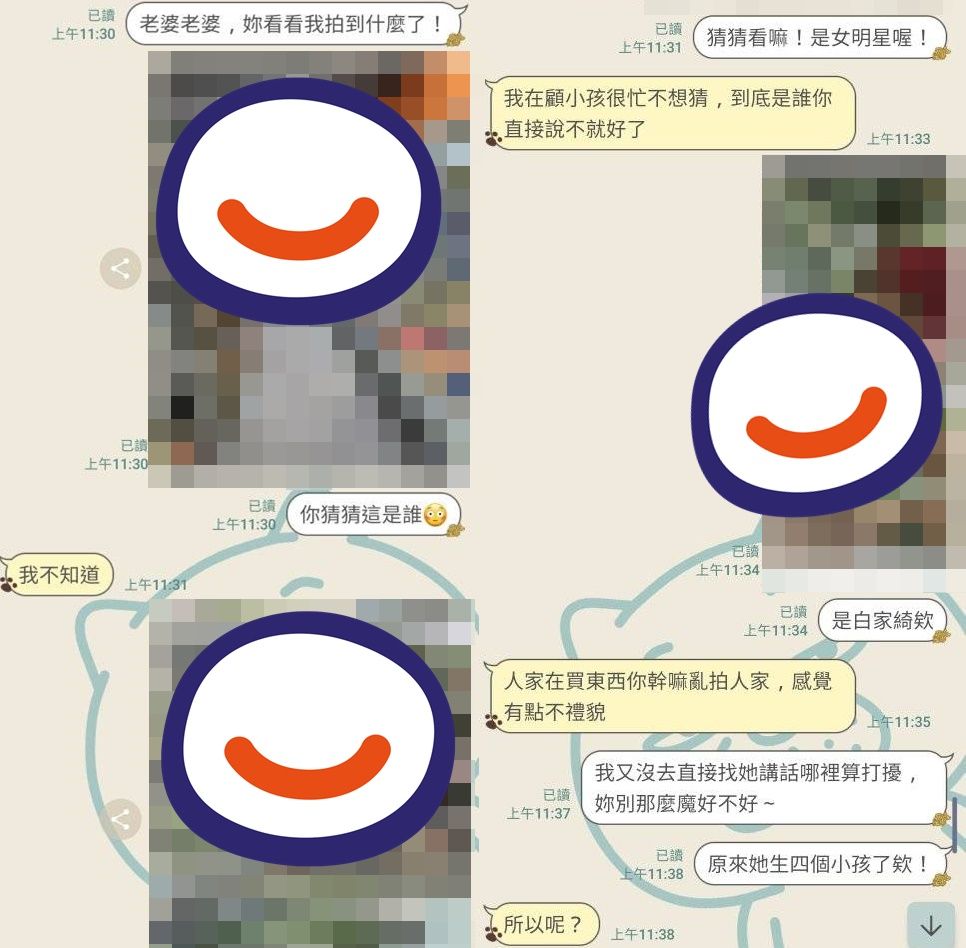 原PO說自己遇到的是白家綺後,老婆又說「人家在買東西,你幹嘛亂拍人家?感覺有點不禮貌。」原PO則說,「我又沒去直接找她講話,哪裡算打擾?你別那麼魔好不好」。