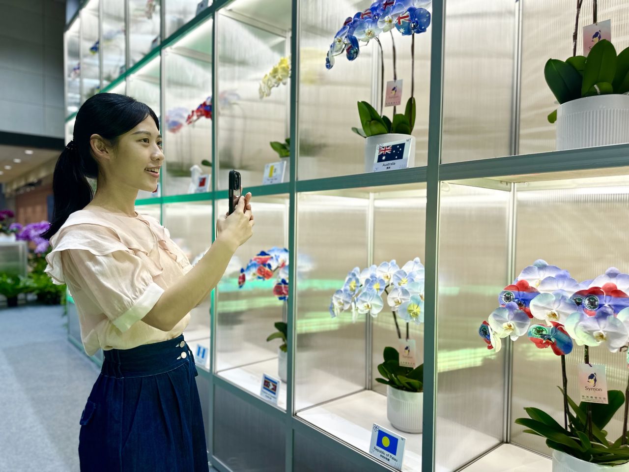 「豐饒福爾摩沙」國旗蘭花牆吸引外國旅客駐足,找尋自己家鄉國旗,對於親眼見到國宴蘭花覺得很幸運;盛開桃紅色蝴蝶蘭大型盆景,也讓接機民眾紛紛合影打卡,感受蘭花之美與台灣豐富的生命力。