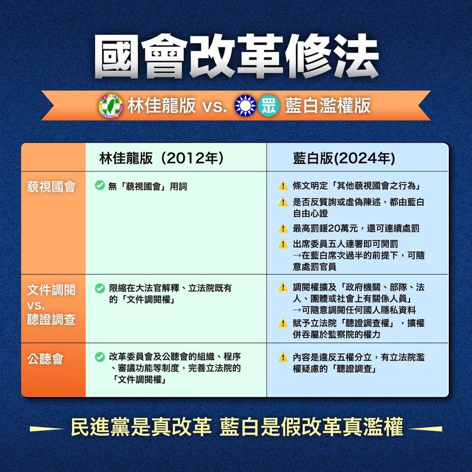 國民黨與民眾黨團力推「國會改革」法案,但修法過程被社會質疑未經完整討論,國民黨今(23日)開記者會指外交部長林佳龍昔日擔任立委期間,也曾有類似主張。不過,民進黨發言人卓冠廷貼出對照表指出,林佳龍2012年版本從未出委員會,且其版本根本沒有「藐視國會」、「反質詢」等意義不明的字眼,他反問藍白「為什麼要硬幹?」
