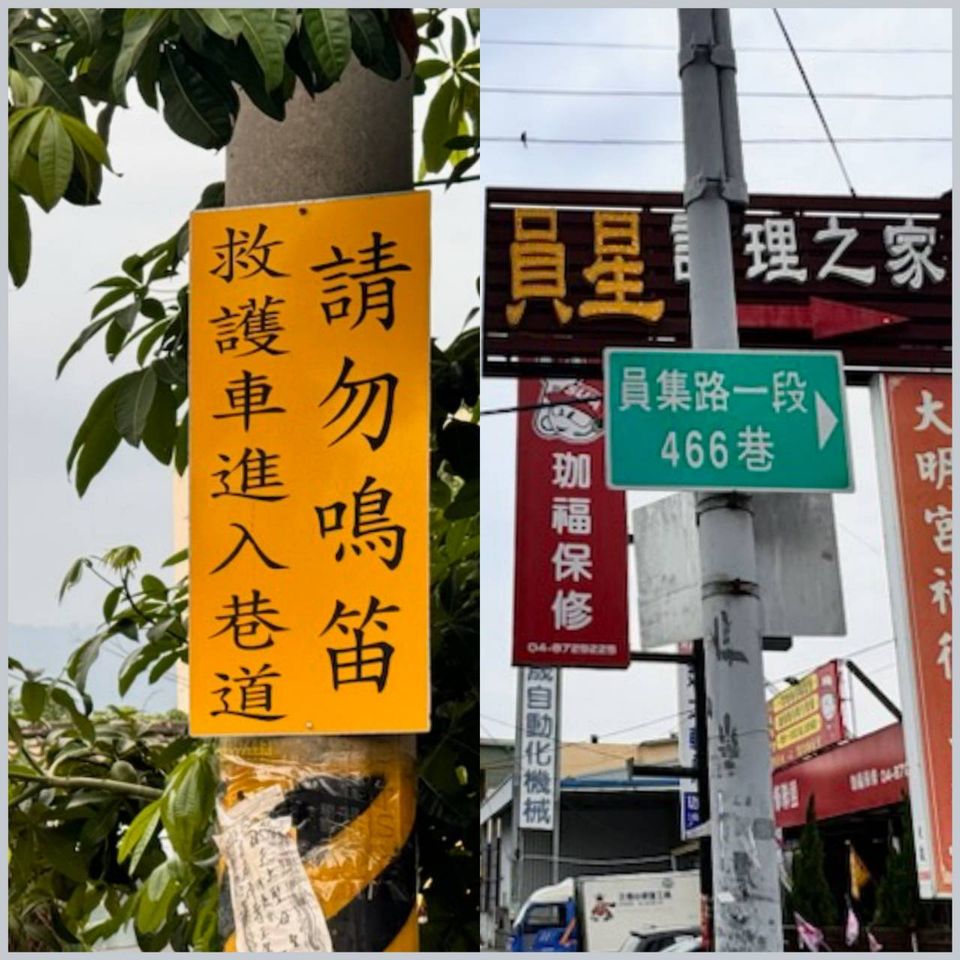 彰化員林市大明里員集路一段,因該路段內設有養護中心,「喔~咿~喔~咿」救護車每天來來往往,鳴笛聲整天響不停,讓住在當地的老人家,越聽心情越鬱卒,都覺得像是「死神的召喚」,里長接到里民陳情,與養護中心協調,在路口樹立「救護車進入巷道請勿鳴笛」的告示牌,成為全台首例。