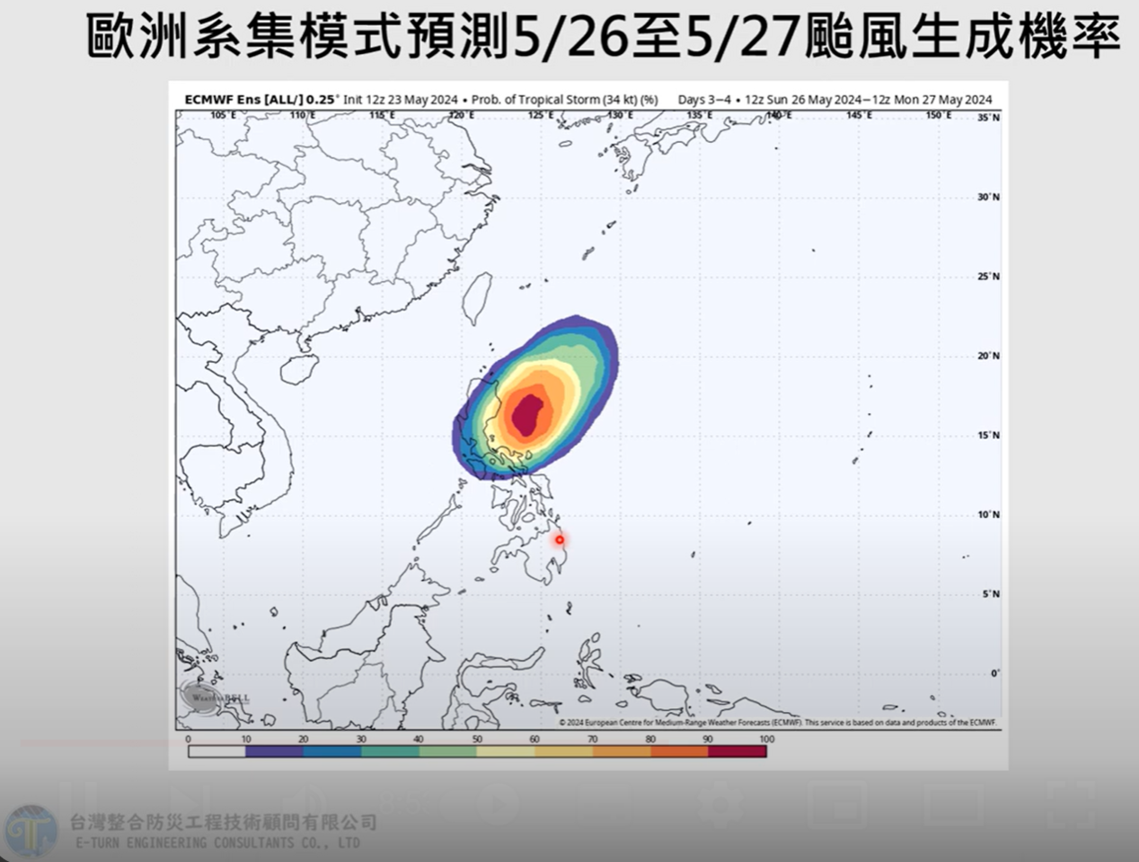 今年首颱「艾維尼」輕颱預計明天生成,台灣整合防災工程技術顧問公司總監賈新興今(24日)在臉書上表示,今年第一個颱風預估周日(26日)至下周一成颱機率超過9成,日本氣象廳則預估於明天(25日)清晨5點左右,第一號颱風艾維尼生成,下周二上午8點位於距離鵝鑾鼻東南方將近687公里海面上。