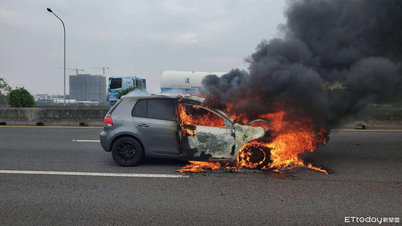 ▲國道1號南向304.3k麻豆段,24日上午9時20分許,發生一起小客車火燒車事故,消耳人員射水搶救。(圖/民眾提供,下同)