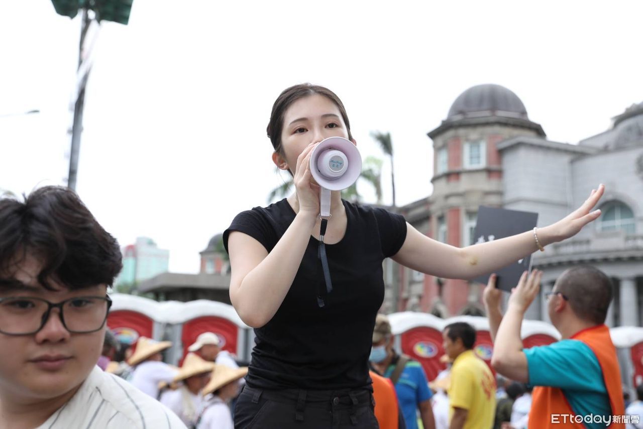 ▲雞排妹在青島東中山南路口幫忙管制人流,用大聲公告訴民眾青島東路已滿,請大家去濟南路。(圖/記者黃克翔攝)