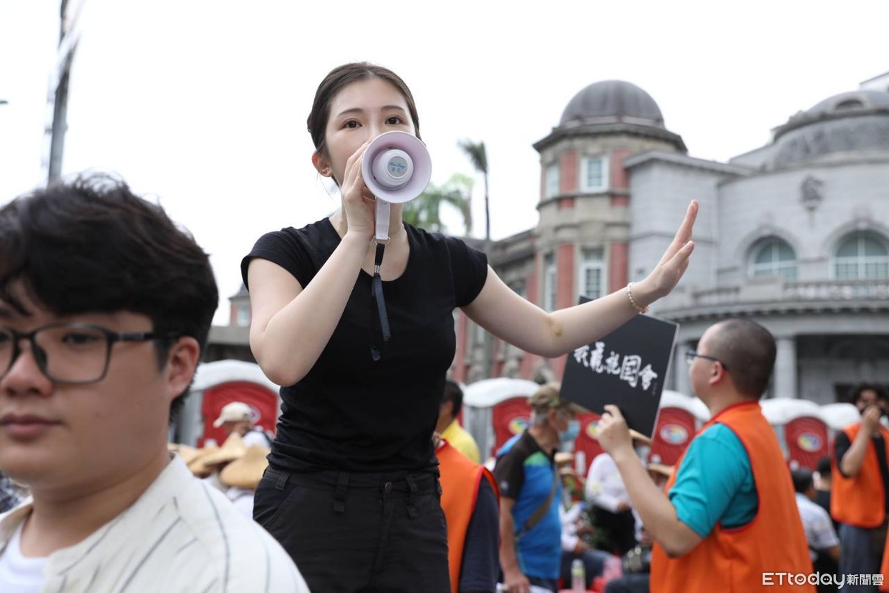 ▲雞排妹在青島東中山南路口幫忙管制人流,用大聲公告訴民眾青島東路已滿,請大家去濟南路。(圖/記者黃克翔攝)