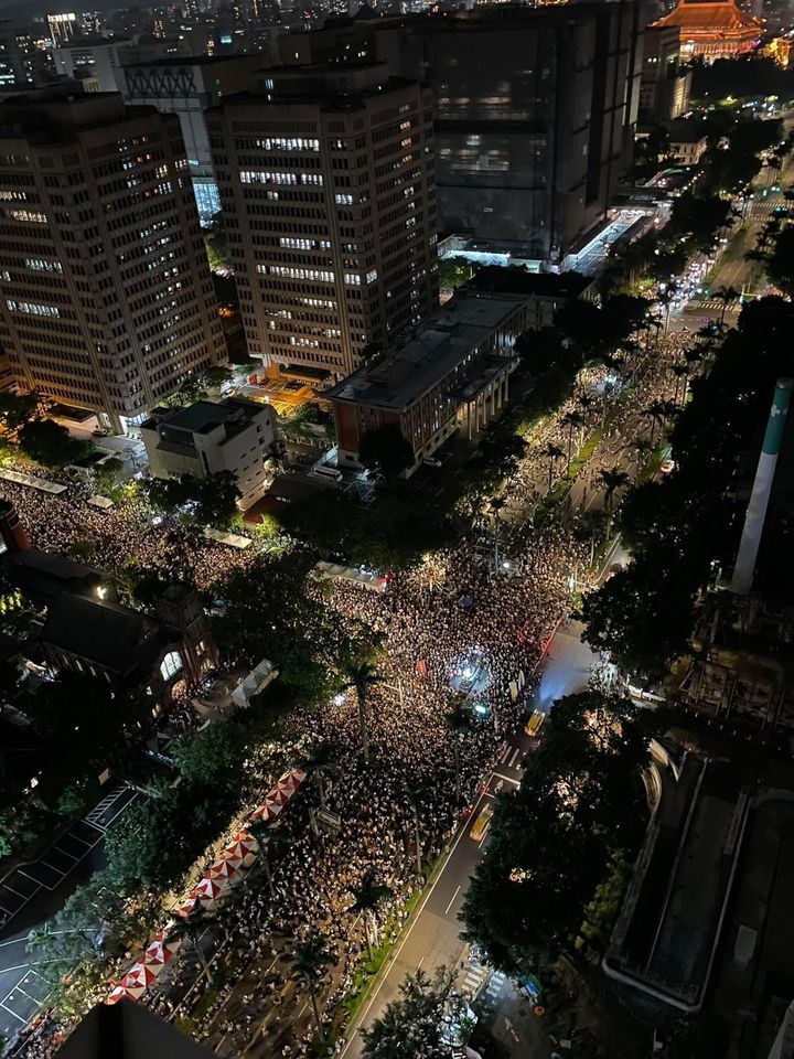 立法院今(24日)續審國會改革相關條文,場內朝野吵的熱烈,場外更是湧入大批民眾抗議,儘管天候不佳,但鄰近的青島東路、中山南路以及濟南路擠滿人潮,更一路漫到忠孝東路。根據主辦單位統計,晚間8點左右,現場已突破8萬人,而最新高空俯瞰圖也曝光,立院附近路口都已經塞爆,重現將近10年前的「太陽花十字」圖形。