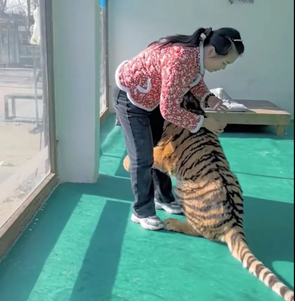 ▼東北虎怕痛,像大貓咪跟飼養員撒嬌 。(圖/翻攝 一隻獵奇的狗)