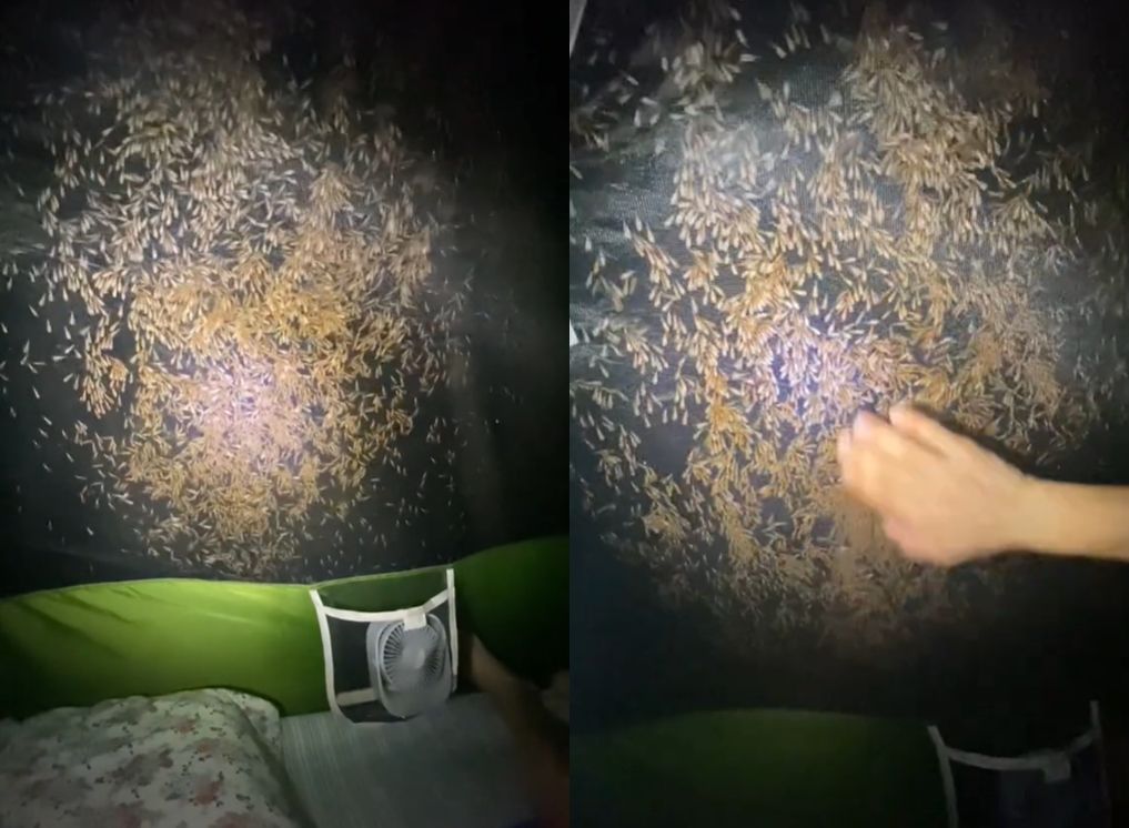 吉爾斯13日上傳影片,說他們「在白蟻窩裡面露營」,仔細一看,畫面中大量白蟻在夜裡爬滿了帳篷外側,撞擊、爬行、振翅聲更發出細微類似雨滴落在帳篷上的聲音,即使拍也拍不掉,因為牠們持續湧上來。