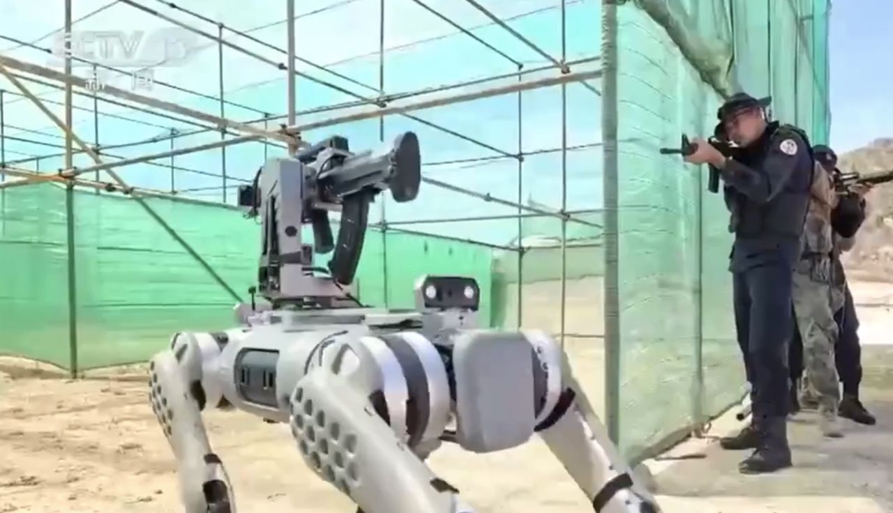 解放軍近日公布了中柬聯合軍演「金龍-2024」的演習畫面,其中一段「機器狗」頂著步槍執行任務的影片大受關注。