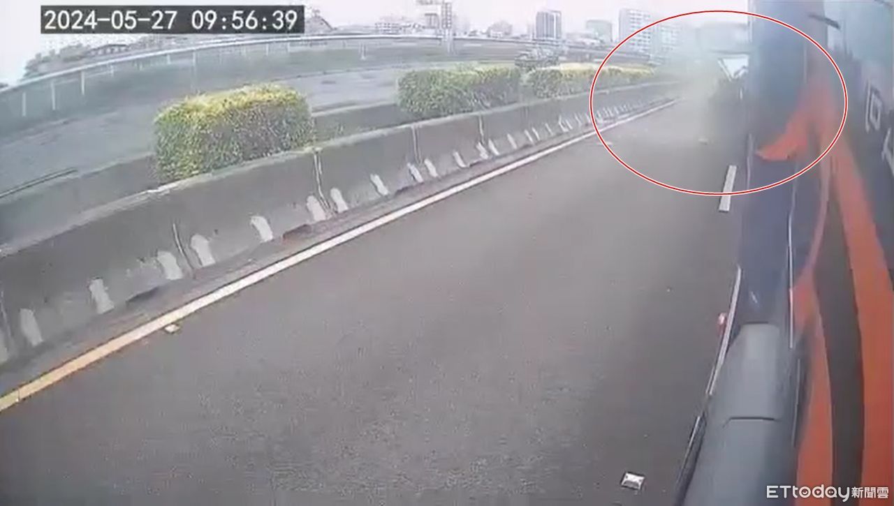 貨櫃車側邊行車紀錄器拍下,當時因前方車流回堵,貨櫃車也踩下煞車緩緩減速,未料後方另輛槽車疑似反應不及,當場向前推撞,導致夾在2車中間的銀色小客車當場遭擠壓變形。