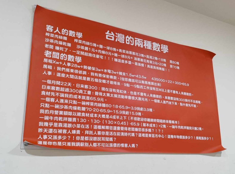 不過,從老闆的角度來看,成本不只食材費用,還包含房租、人事、勞健保、水電、雜支等,「一個客人進來只點一碗榨菜肉絲麵,我虧3.9塊;只點一碗沙茶肉燥乾麵,我虧15.9塊;一碗牛肉乾拌麵賣130元,我只賺2塊,幾乎是靠湯跟小菜在活,這樣解釋您還會覺得老闆賺您很多嗎?」