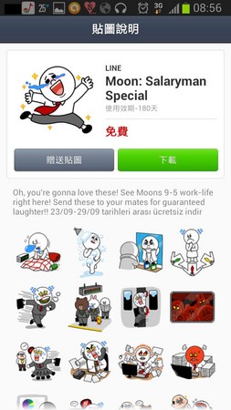 饅頭人上班族篇的貼圖,現在提供給土耳其的用戶免費下載中,真的是讓人好羨慕,雖然說下載期限只到9/29,但是可以免費使用180天。