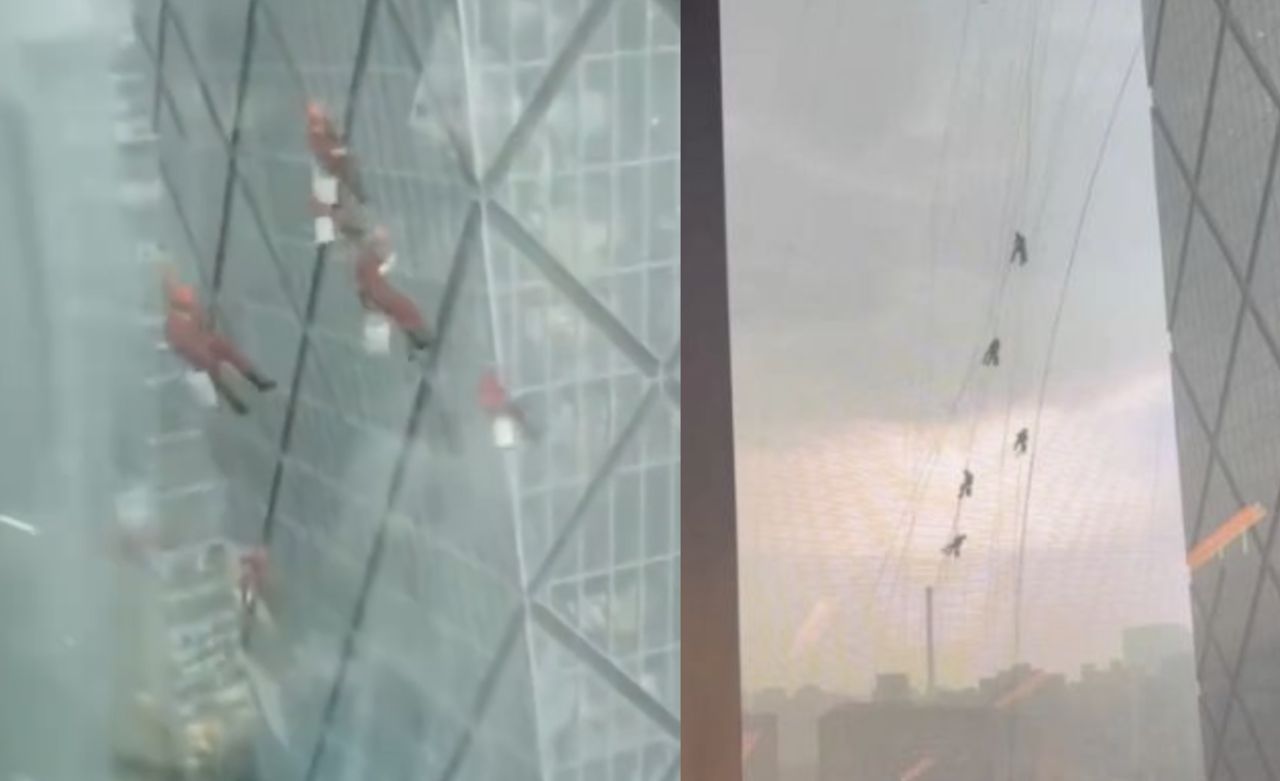 從影片中可以發現,工人們當時用繩索吊掛在俗稱「大褲叉」的「中央電視台」總部大樓上方,正在進行高空洗窗的工作。