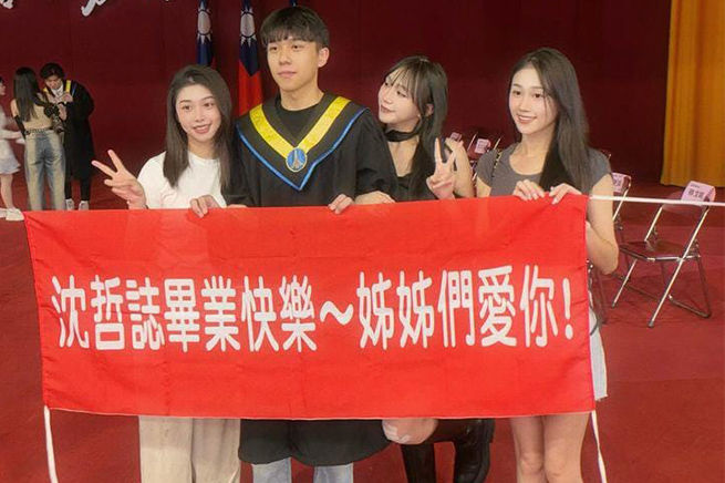 臉書社團《爆廢1公社》有張照片,一位東海大學男大生畢業典禮時,有三位正妹包圍,並舉著紅色布條「沈哲誌畢業快樂~姊姊們愛你!」、「我弟交代我們不要太浮誇,姊姊們收到了」。