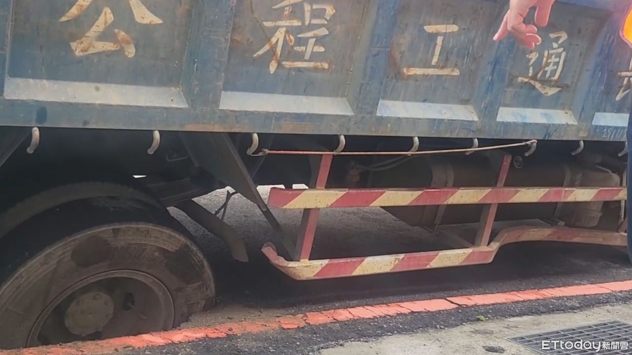 ▲整輛工程車傾斜,民眾無奈又傻眼。(圖/市議員江和樹提供)