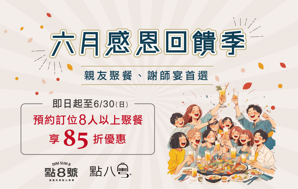 點八餐飲集團推出「六月感恩回饋季」,即日起至6月30日止,凡於點八餐飲旗下「點8號」、「點八粵」電話或網路訂位滿8人以上,結帳即享全單餐點85折優惠。