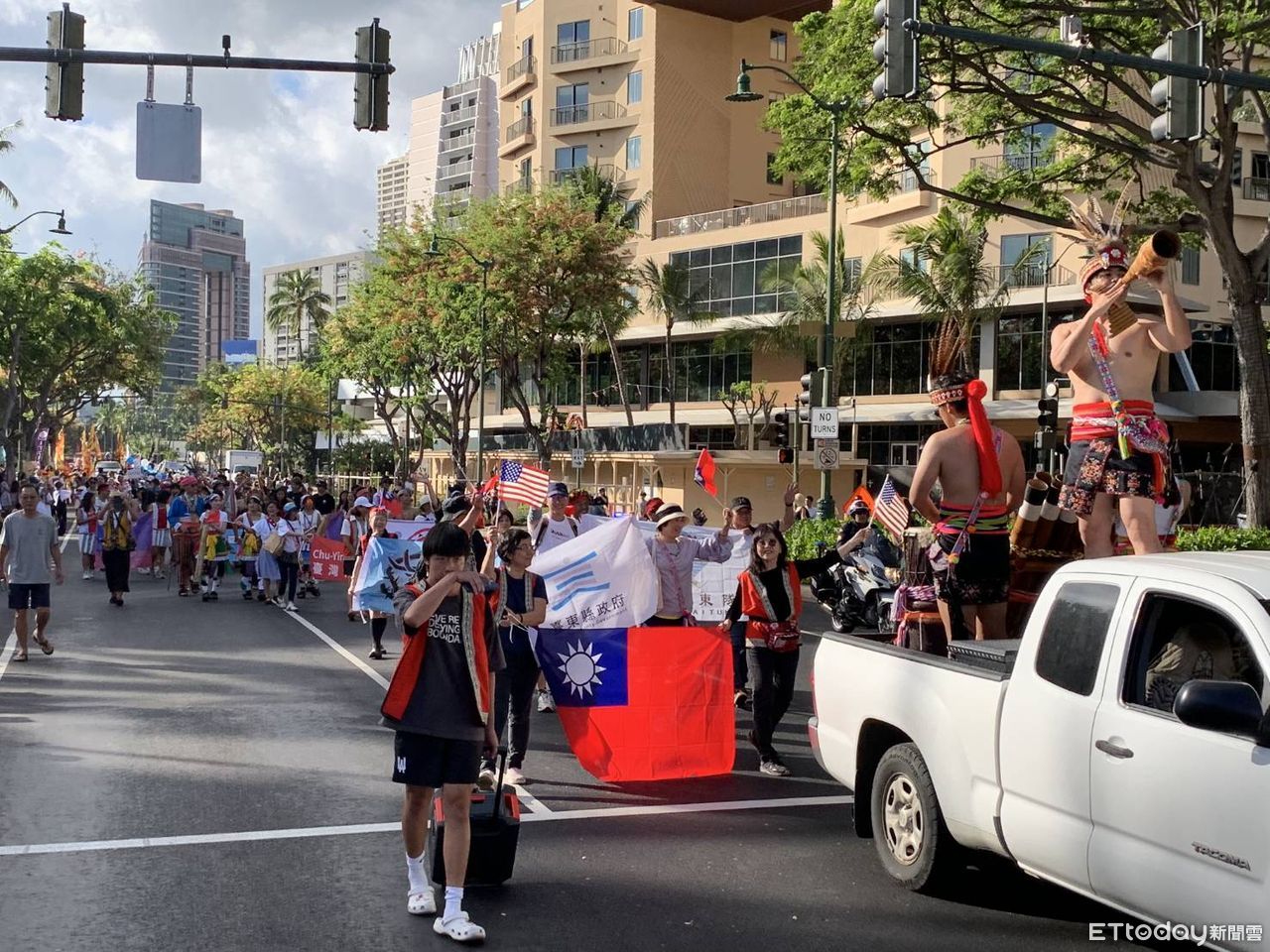 臺東縣政府在夏威夷文化交流期間,積極參與地方性活動,深化與在地的連結,9日饒慶鈴縣長率百餘人組成隊伍,隊員手持臺灣國旗、臺東縣旗及各參與團隊旗幟,加入2024 Pan-Pacific Festival踩街遊行行列,齊步走在歐胡島最熱鬧的Kalākaua Avenue大道,向南太平洋島嶼國家展現臺東代表隊的最高精神。