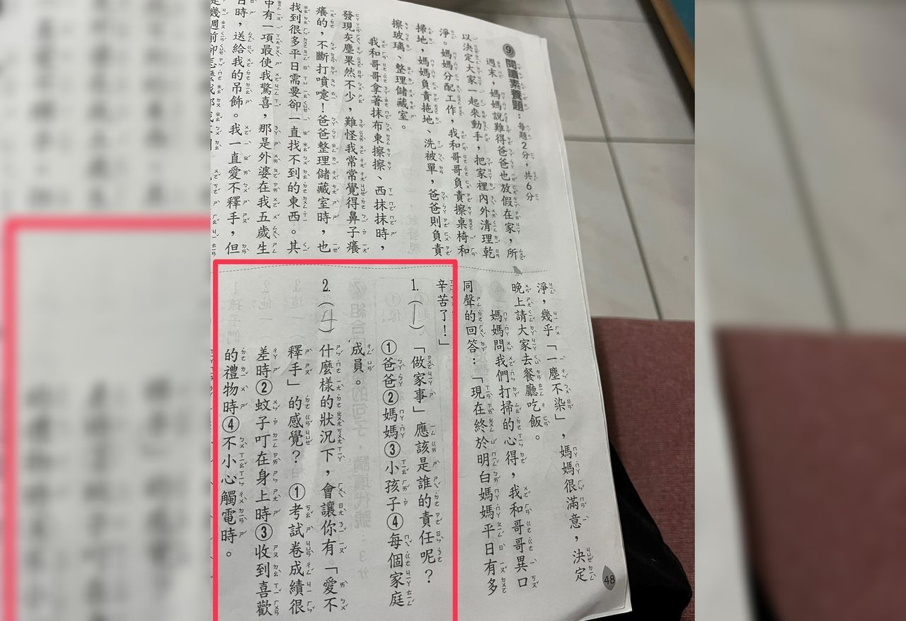 而在附上的照片中,只見第一題題目是「做家事應該是誰的責任」,女童的答案為「爸爸」;第二題題目是「什麼樣的狀況下,會讓你有愛不釋手的感覺」,女童的答案則是「不小心觸電時」。