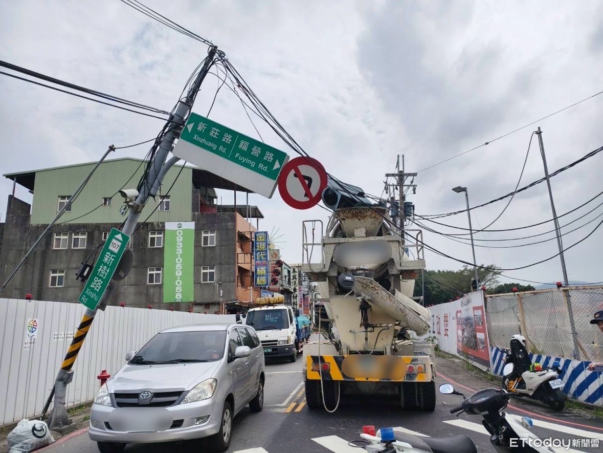 警方指出,下午1時許新莊路與新樹路口發生水泥預拌車交通事故,經了解,67歲陳姓男駕駛要去建國二路的工地卸水泥,疑似路況不熟,於新莊路左轉新樹路往樹林方向(新莊路禁行15噸以上大貨車),轉彎過程中該車進料裝置勾到電線,拉倒號誌桿,導致號誌桿傾斜,現場無人受傷,駕駛酒測值為0.00mg/l。