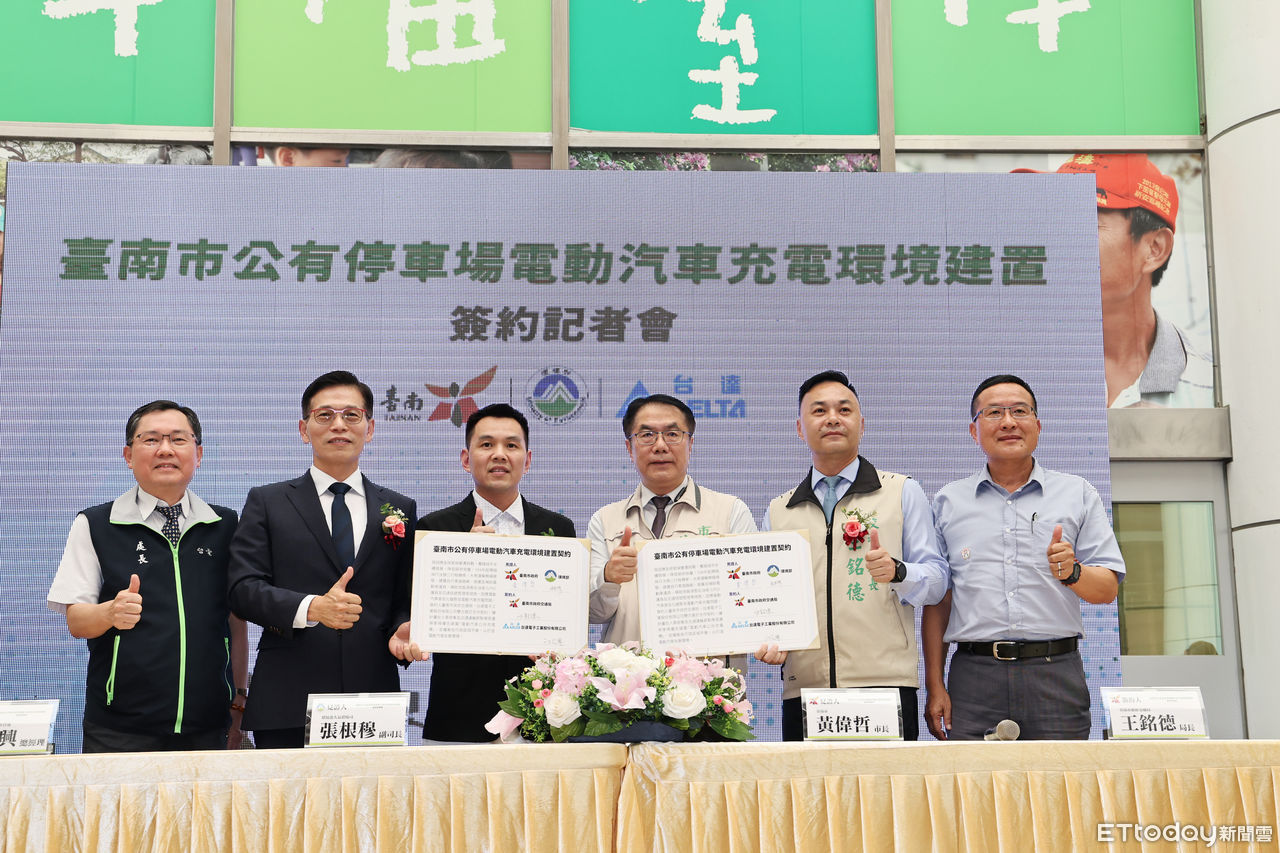 ▲台南市政府8日舉行「台南市公有停車場電動汽車充電環境建置簽約」記者會,市長黃偉哲宣布成功爭取中央經費2.5億元補助,將於全市37個行政區總計202處場域建置充電。(圖/記者林東良翻攝,下同)