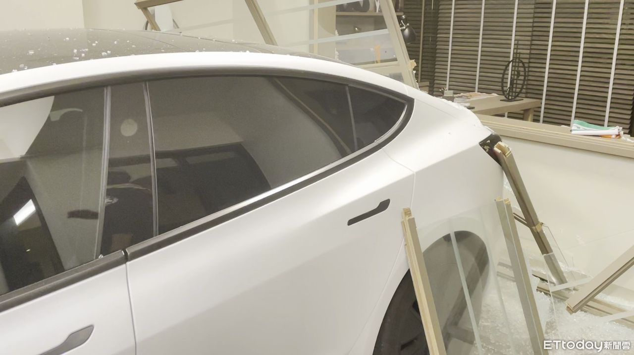 ▲台南安南區一處民宅驚傳氣爆,造成正對面3戶受波及,其中鄰居剛買2個月的特斯拉也遭殃,遭氣爆的窗框直接砸毀,而噴飛的碎玻璃也刮花車身。(圖/記者林東良翻攝,下同)