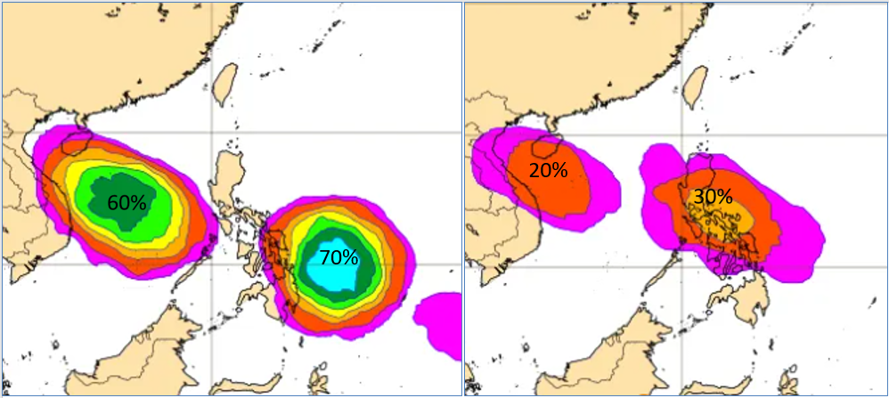 最新(10日20時)歐洲模式(ECMWF)50次系集模擬顯示,14日前後菲律賓東方至南海一帶「熱帶低壓」存在的機率,分別調高為70%及60%。16日前後呂宋島附近「輕颱」存在的機率,則仍維持為30%;台灣則在機率值之外。由於模擬持續調整中,對台灣會有什麼影響?應繼續觀察。