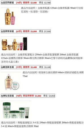 法國秀髮保養品牌巴黎卡詩在2013年週年慶推出特惠組,最低下殺67折,其中,4大熱銷組合,包括金緻柔馭露搭配的金質閃耀組和金緻奢華組、頭皮抗老精華液搭配的賦活新生組,還有秋冬養護受損髮的煥髮重建組。