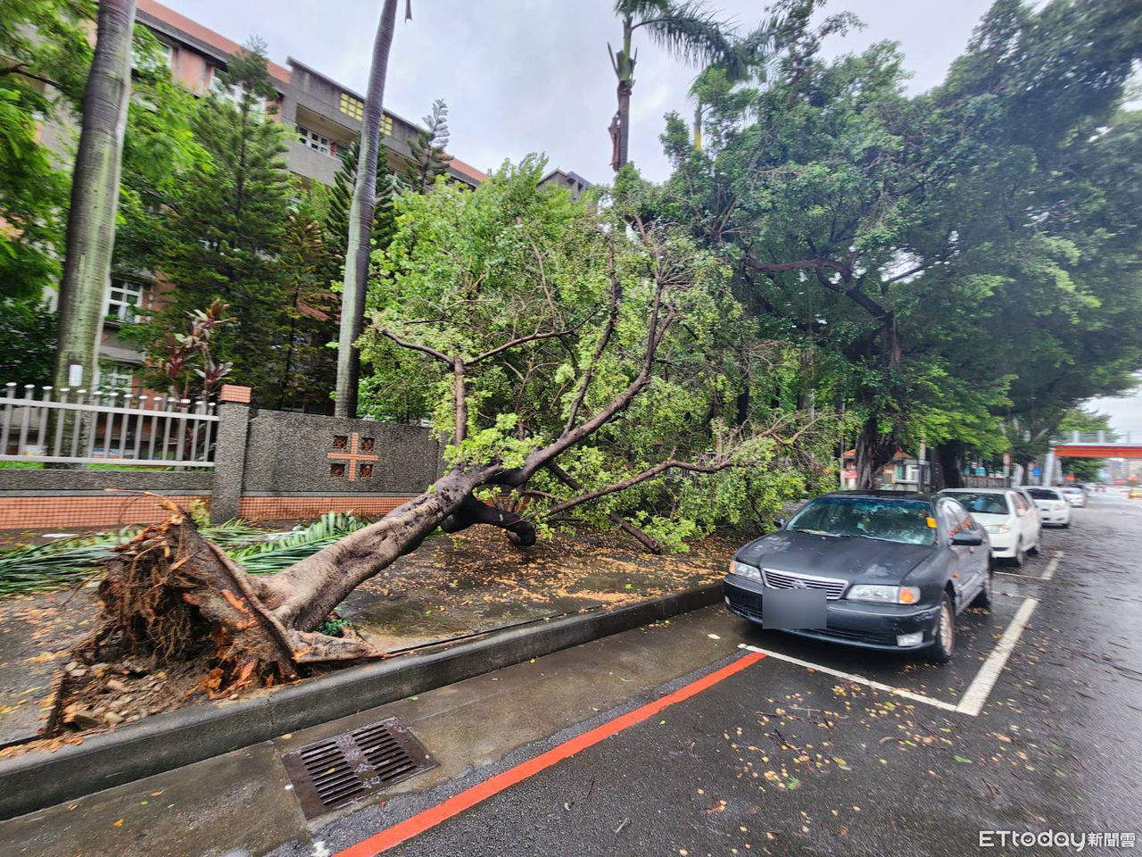 記者游瓊華、葉國吏/台中報導 凱米颱風造成災情,台中市東區力行國小大樹被連根拔起,直接擋住校門,今天學生上課必須跨過倒下的樹木進入校區。▼台中力行國小大樹被連根拔起。(圖/記者游瓊華攝)