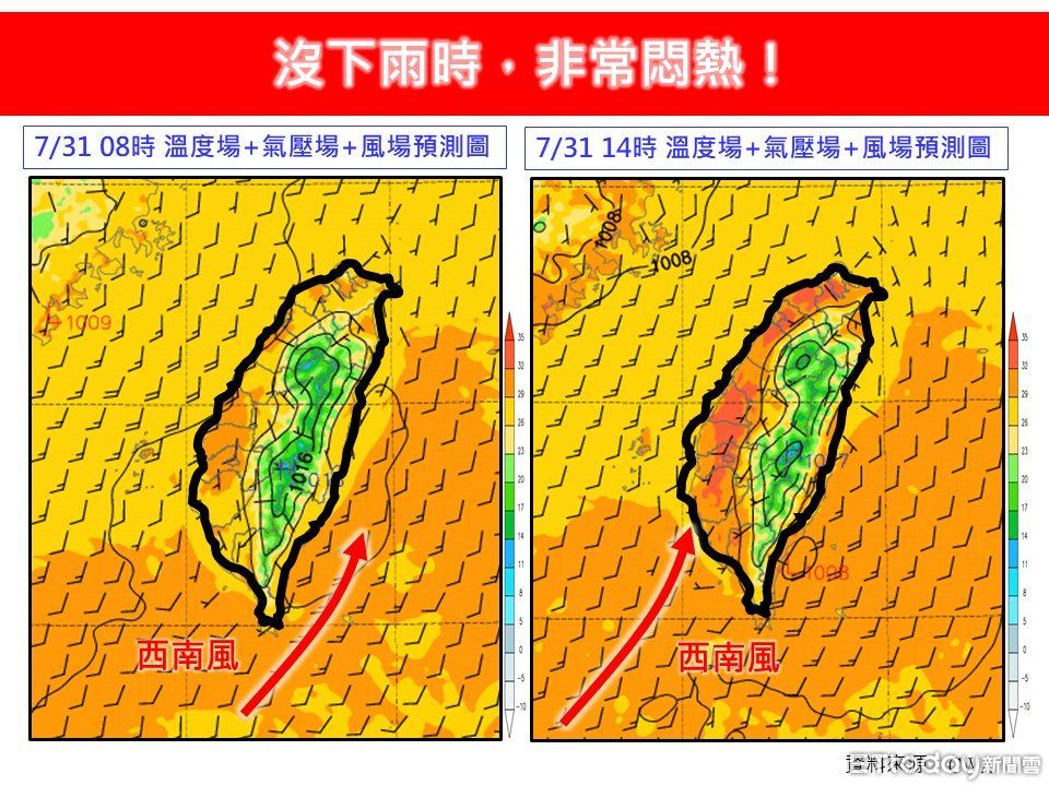 夏日炎炎,中央氣象署今(31日)針對台東縣發布高溫資訊,有焚風發生的機率,預測台北市體感溫度達到40度。氣象專家林得恩表示,沒下雨時非常悶熱,今日環境風場轉為西南風,各地白天多為大晴天,雲量偏少,高溫炎熱的夏季天氣型態。