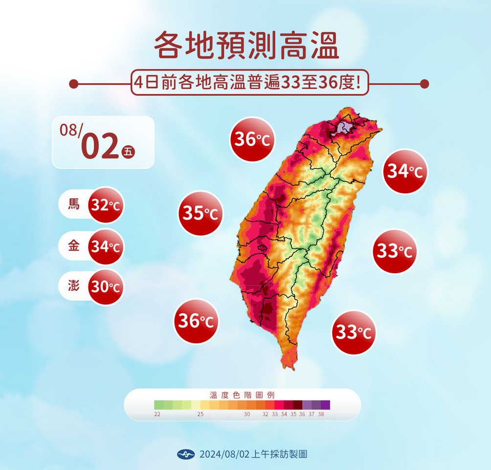 溫度方面,李孟軒說明,周日之前各地高溫約33到36度,今天要留意大台北有36度以上高溫,中南部近山區、花東縱谷也有35到36度以上高溫。