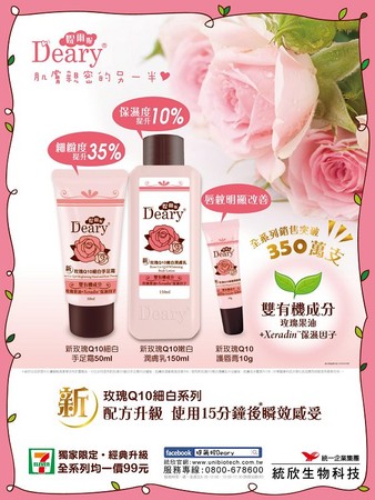 ▲統欣生技最新產品「Deary 媞爾妮新玫瑰 Q10 細白身體保養系列」,即將於 10/14 隆重上市!為回饋消費者,該系列三項產品均一價 99 元,並在 7-ELEVEN 獨家販售。(圖/業者提供)