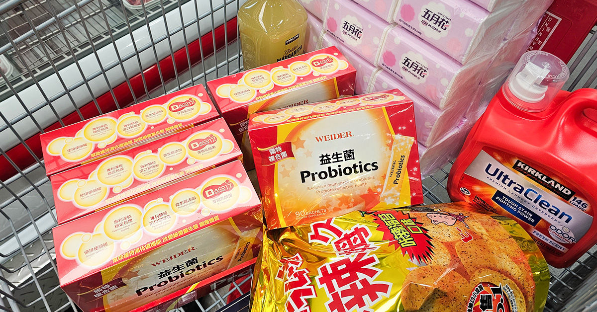 「威德益生菌」折價首日(9/30),吸引大批民眾前往搶購。連鎖賣場內陳列商品的大型棧板被消費者包圍,許多民眾購物車內放滿6盒,更不少人在架前等候補貨。